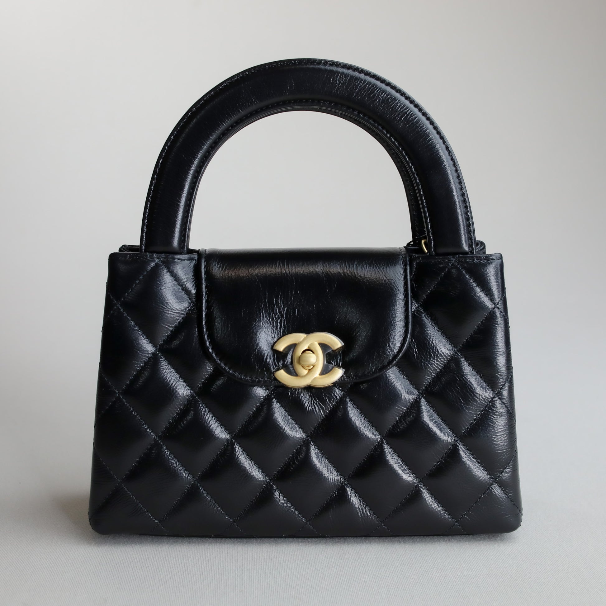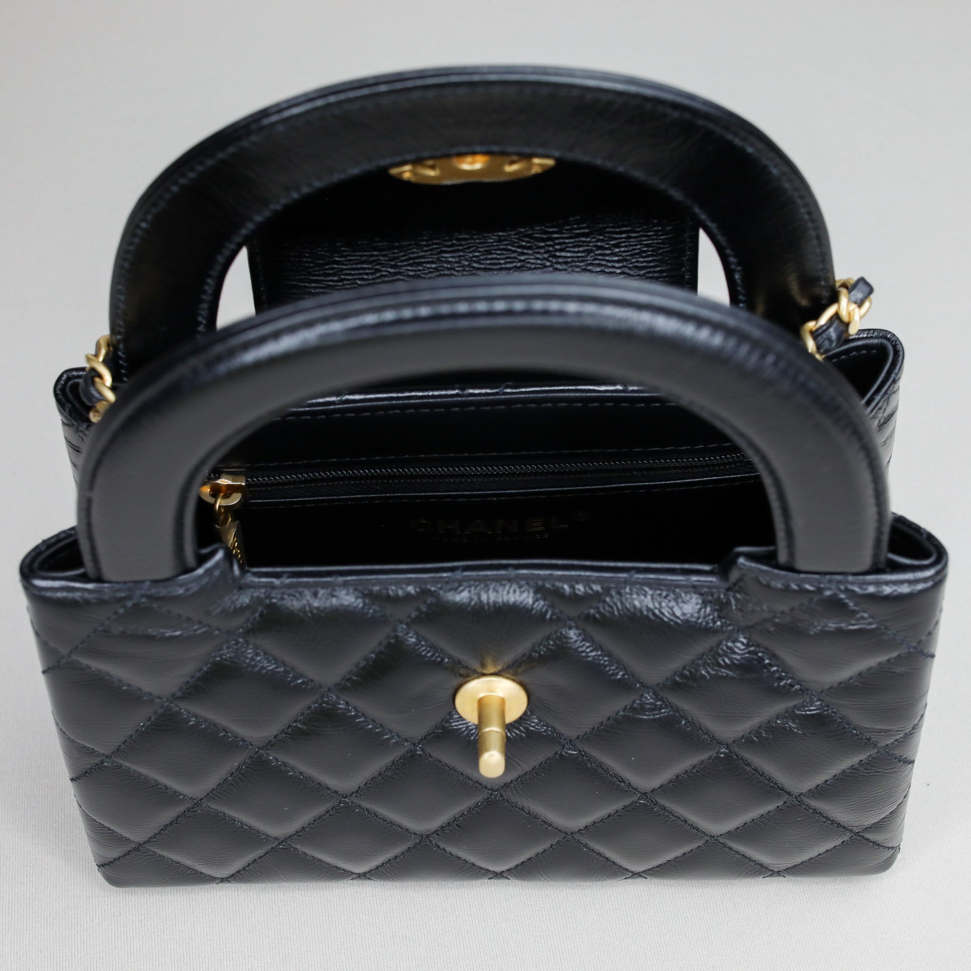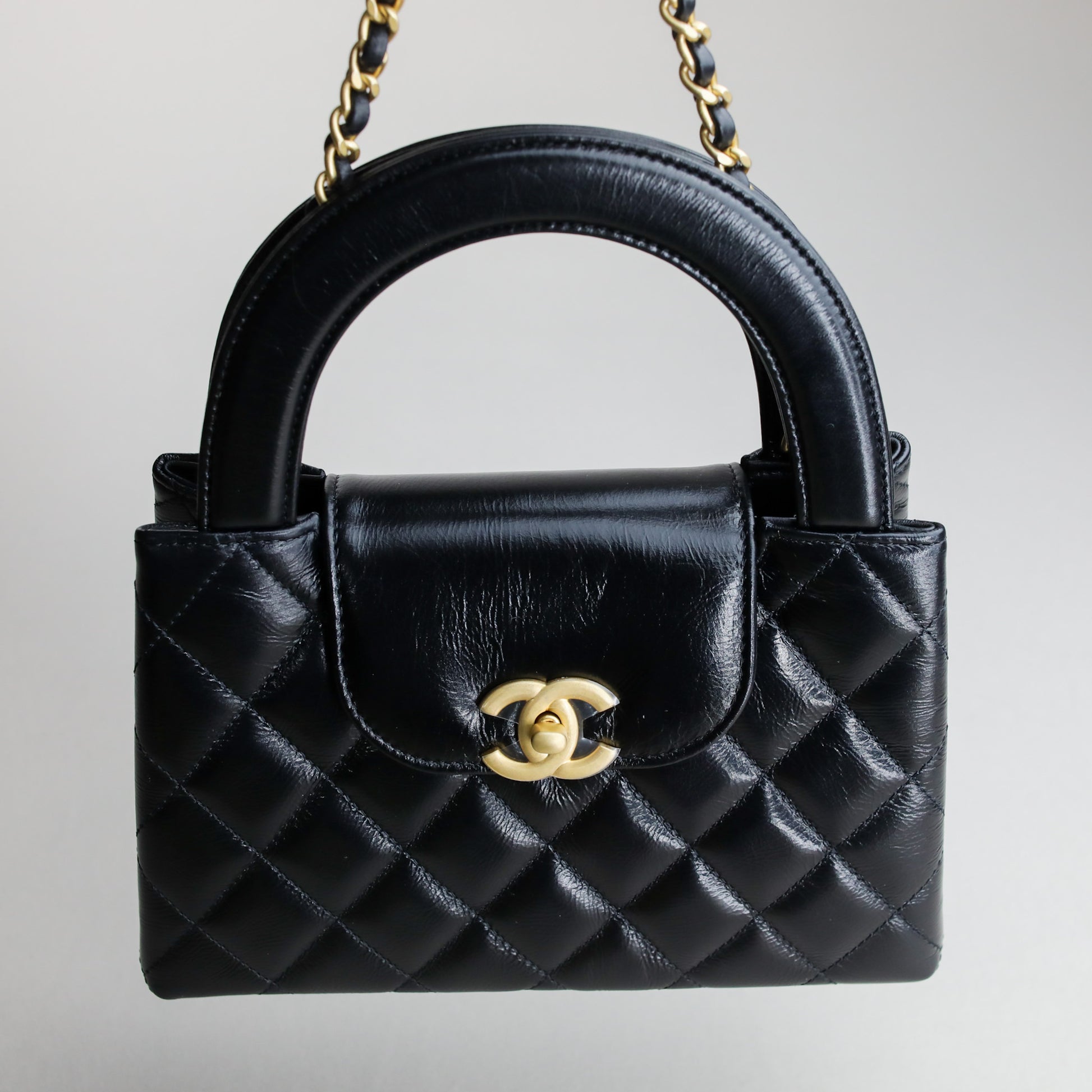 Chanel Kelly Nano shopping bag in black calfskin with structured top handle silhouette. Finished with the classic Chanel quilting and gold-tone hardware, this piece is compact but makes a statement.